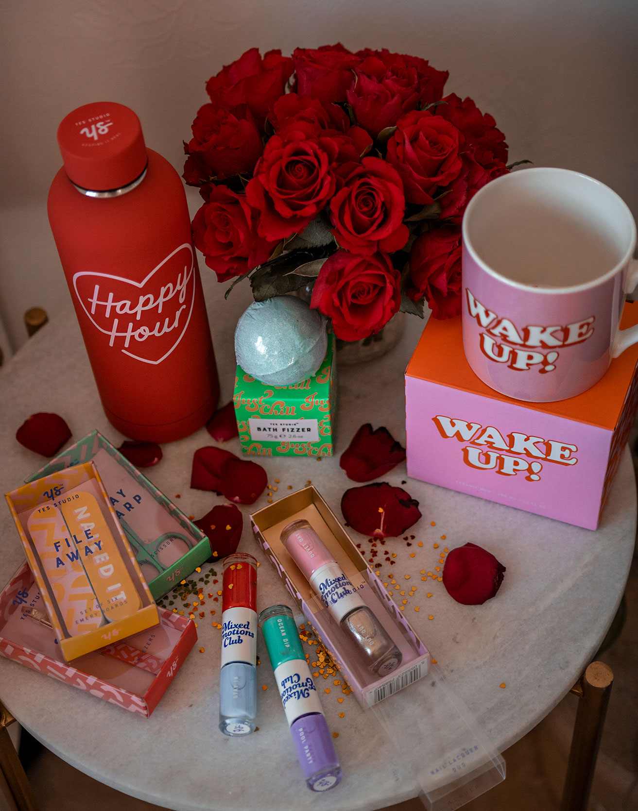 Whether itβs to hold your cocktails or your hot chocolates, the cute mugs that Yes Studio have to offer cover your every need. We have the βItβs not you itβs Mondayβ mug, the βI just want to hang out with my dogβ mug, and my personal favourite β the βwake upβ mug!Β All three come in perfectly for a girly get together, but not only thatβ¦ we all know how fab mugs come in for gifts donβt we? I have many gal pals who the βI just want to hang out with my dogβ quote would fit to a T. I canβt wait to pick who Iβm going to give this little mug to. Yes Studio have so many other designs too. Iβm also obsessed with the Happy Hour Water BottleΒ β water bottles are ideal gifts for everyone as theyβre an office staple, a workout staple, a road trip stapleβ¦ you get the gist. Itβs got the cutest design and it keeps your drink so cold for hours on end, I love mine so much that Iβm definitely gifting it to myself this Valentines. Itβs got a soft touch finish and itβs just so lovely and feminine, highly recommend this one if you love your drinks ice cold!